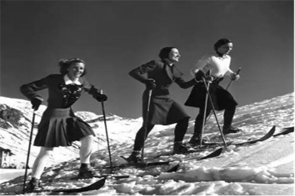 20世紀(jì)30年代開始,滑雪服裝開始融入時(shí)尚元素也更加具有設(shè)計(jì)感。用來(lái)滑雪的服裝增加了收身剪裁的上衣,褲子也以闊腿褲為主。以下呢是當(dāng)時(shí)這個(gè)階段幾位女性穿的衣服搭配短裙。