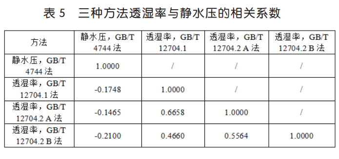 表 1 的測(cè)試數(shù)據(jù),對(duì)三種透濕率測(cè)試指標(biāo)和靜水壓指標(biāo)進(jìn)行相關(guān)系數(shù)分析,具體見(jiàn)表 5。