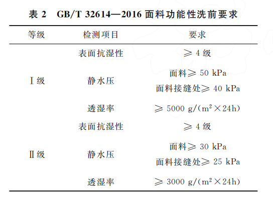 GB/T32614—2016《戶外運動服裝 沖鋒衣》 標(biāo)準(zhǔn)依據(jù)沖鋒衣的功能指標(biāo)對其進行了級別劃 分。I級產(chǎn)品的防水透濕要求最為嚴(yán)格,適用于 專業(yè)戶外活動;II級產(chǎn)品相對I級產(chǎn)品的防水透 濕指標(biāo)稍低,可滿足日常的戶外休閑等活動。對 于劃分I級、II級的功能性指標(biāo),應(yīng)在吊牌中標(biāo)注 “I級”或“II級”,不標(biāo)注的均視為I級產(chǎn)品。面料 功能性又分洗前和洗后要求,本文考慮了樣品成 本和比較目的達成兩方面的原因,只測試和比較 面料功能性洗前要求,見表2。