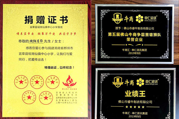 大家看一下下面的獎項(xiàng)就知道睿牛制衣還是個不錯的良心企業(yè)也是一家有實(shí)力的沖鋒衣生產(chǎn)廠家,我們的總經(jīng)理同時也是非常有愛心的,她經(jīng)常做善事來匯報社會,因?yàn)樗?出生在70年代從小的生活也是很艱苦的,他非常能夠理解學(xué)生渴望讀書的那種心情,所以我們老板歐陽月華女士特地愛心參與捐贈宜章縣瑤崗仙鎮(zhèn)中心小學(xué)落成,凝聚萬千愛,共圓心學(xué)子夢!還有我們總經(jīng)理系上絲帶的照片,讓大家共同把愛傳遞出去!