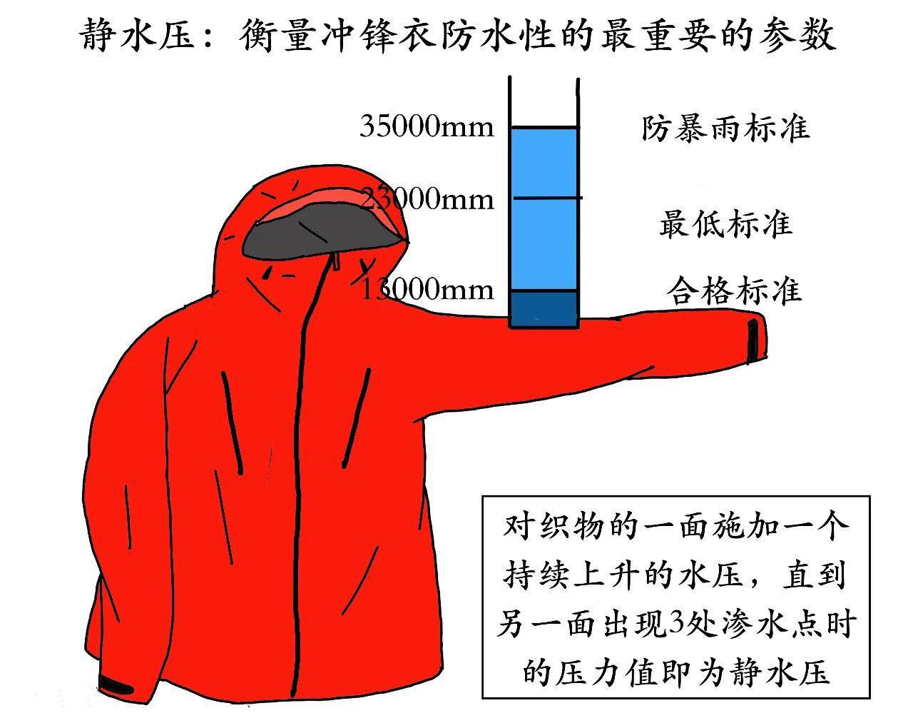 沖鋒衣的防水性能的重要參數(shù)—靜水壓。很多山友們認(rèn)為把水潑在沖鋒衣上,不漏水就說明防水,這個(gè)檢驗(yàn)方法是錯(cuò)誤的!其實(shí),除了水的自然滲透,外界施加的壓力也會(huì)迫使水穿透面料。而沖鋒衣的靜水壓的高低即可標(biāo)識(shí)它抵抗被水穿透的能力。