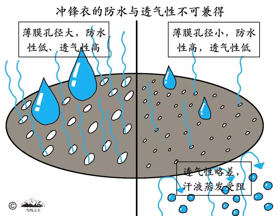 防水性越高,透氣性越弱——這是因為沖鋒衣的防水和透氣都是利用同一通道——薄膜微孔。在厚此薄彼之間就造就了兩者之間的矛盾:提高防水性,就需要讓薄膜微孔更小、更密,就越不利于汗水蒸發(fā)排出。因此,沖鋒衣的防水性越高,透氣性越弱,反之亦然。