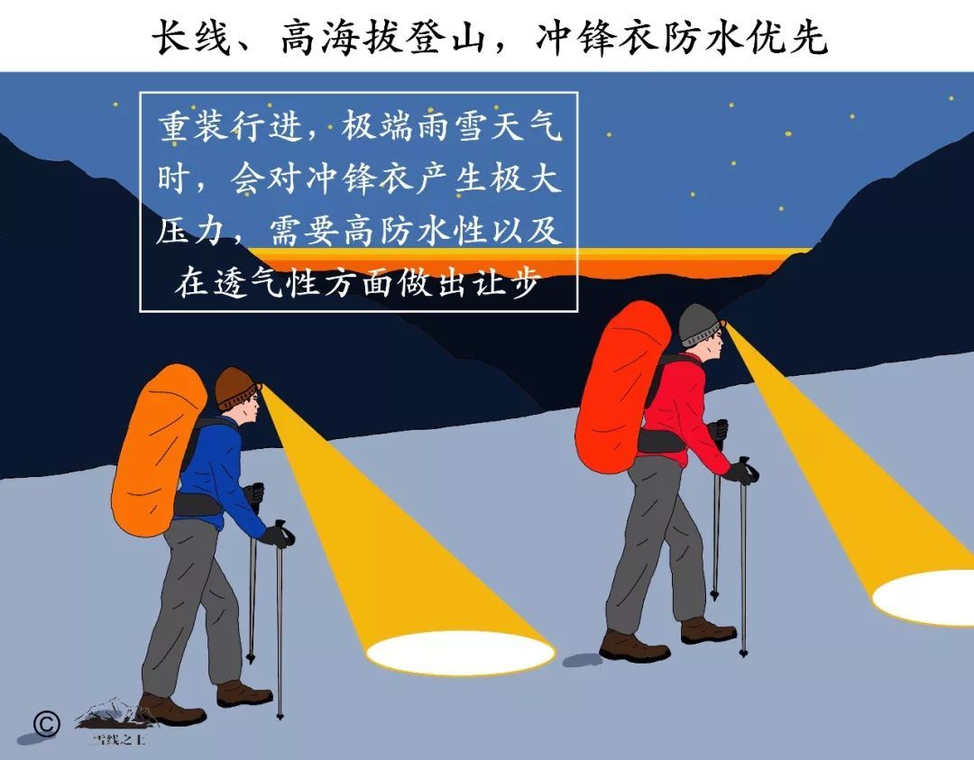 長線重裝徒步、高海拔登山——這種活動需要背負重裝包,極端雨雪天氣沖鋒衣有因背包壓力浸透的可能,從而帶來失溫風險。所以,此類活動需要沖鋒衣具備高防水性,而在透氣性方面做出讓步,比如GORE-TEX Pro系列產(chǎn)品。