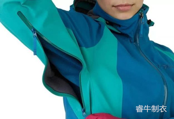 多數(shù)沖鋒衣都有設(shè)計在腋下散熱拉鏈的,它的作用是讓使用者在戶外活動中,根據(jù)實際使用情況調(diào)節(jié)服裝內(nèi)的溫度。對于專業(yè)沖鋒衣來說,拉鏈一般都采用防水功能的產(chǎn)品。而滑雪服因為其運動的特點,一般是把拉鏈設(shè)計在胸口附近或者上肢的前方。和沖鋒衣的相同的是?;┓母邫n產(chǎn)品也使用防水拉鏈。