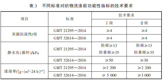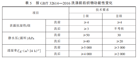 考慮到防水透濕面料功能的 耐用性,GB/T 32614—2016 中增加 了對(duì)功能性指標(biāo)的洗后測試,采用 標(biāo)準(zhǔn) GB/T 8629—2001《紡織品 試 驗(yàn)用家庭洗滌和干燥程序》 中 的 5A 程 序 洗 滌 3 次 并 懸 掛 晾 干,洗 后的指標(biāo)要求變化具體見表 5,相 較于洗前,指標(biāo)略有降低。
