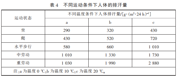 GB/T 32614—2016 中 功 能 性 指 標(biāo)(洗 前)與 GB/T 21295—2014 《服裝理化性能的技術(shù)要求》對(duì)比 可知,GB/T 32614—2016 中對(duì)于拒 水、耐靜水壓和透濕率 3 項(xiàng)功能性 要求更高,尤其是Ⅰ類產(chǎn)品的耐靜 水壓和透濕率遠(yuǎn)高于 GB/T 21295— 2014 的技術(shù)要求。兩標(biāo)準(zhǔn)對(duì)這 3 項(xiàng) 性能要求對(duì)比見 表 3。 滿 足 GB/T 32614—2016 的沖鋒衣可以抵擋暴 雨的沖擊,也滿足登山、攀巖等大 運(yùn)動(dòng)量下的透濕要求,不同條件下 人體的排汗量見表 4。