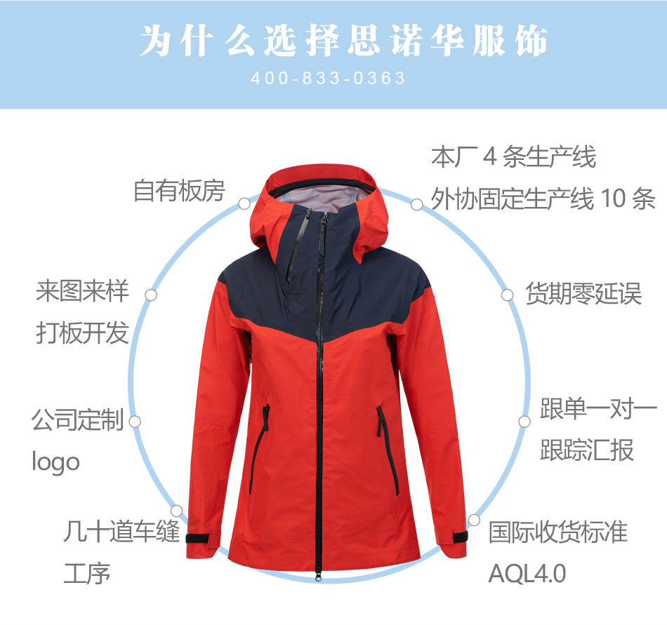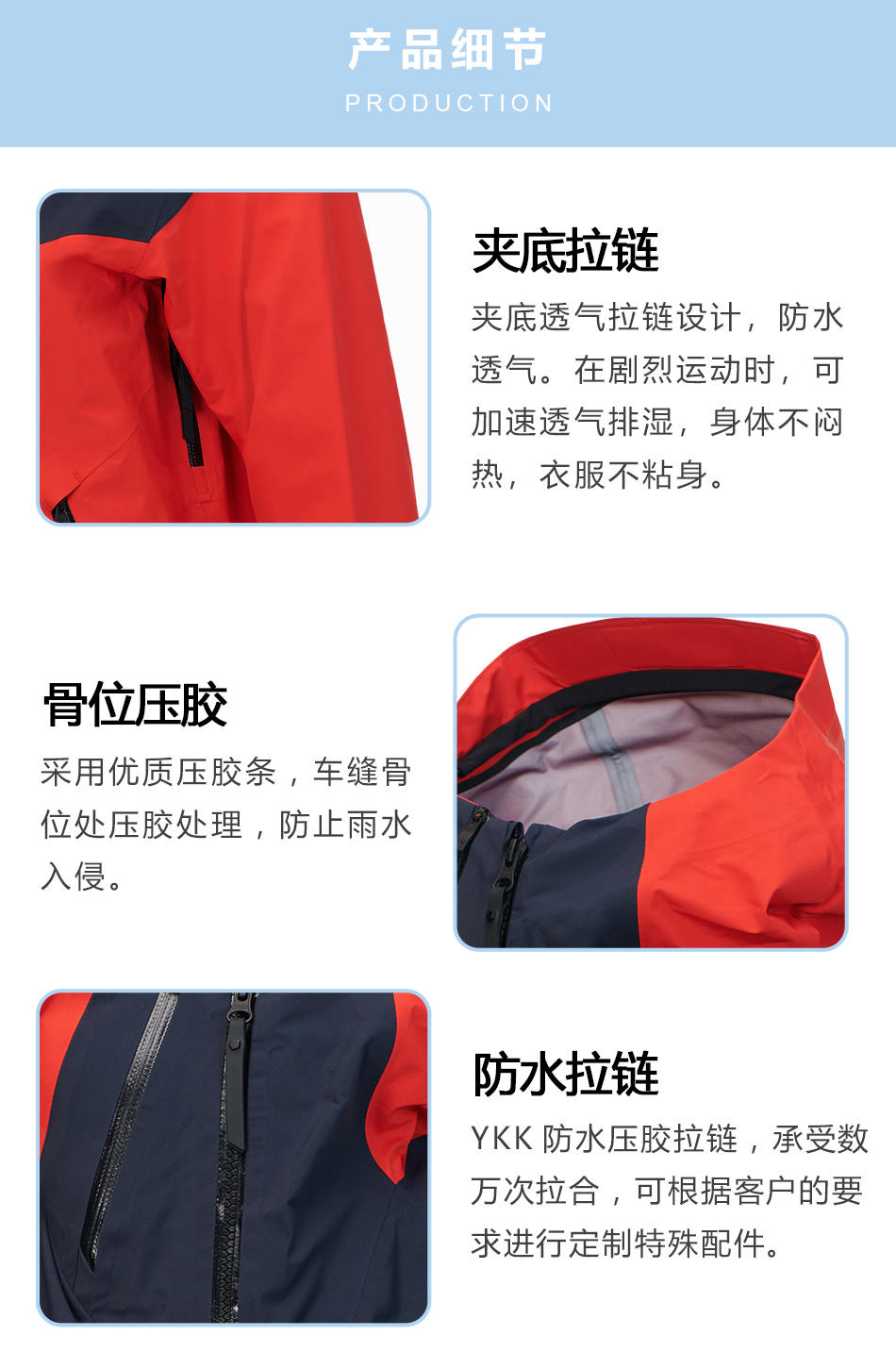 防水拉鏈:單層沖鋒衣生產(chǎn)使用YKK防水壓膠拉鏈,承受數(shù)萬(wàn)次拉合,可根據(jù)客戶(hù)的要求進(jìn)行定制特殊配件。