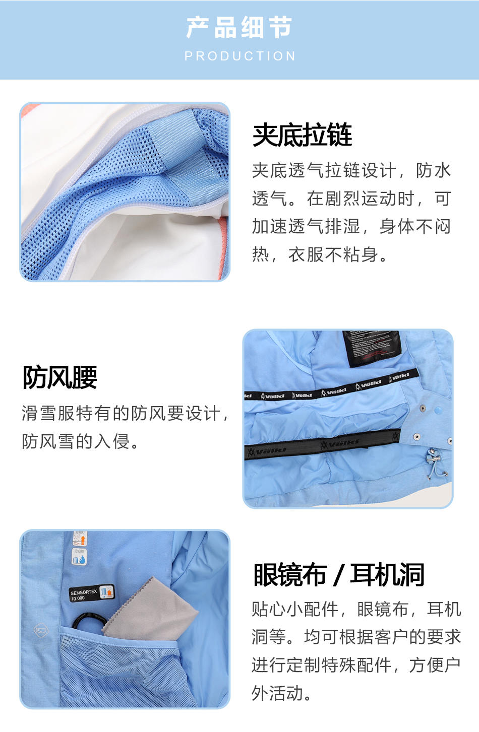 防水拉鏈采用無縫壓膠防水拉鏈激光熱封工藝貼合,面料采用進(jìn)口防水透氣涂層膜,使防水透氣膜與面料完美結(jié)合。可根據(jù)客戶需求完成戶外沖鋒衣定制。
