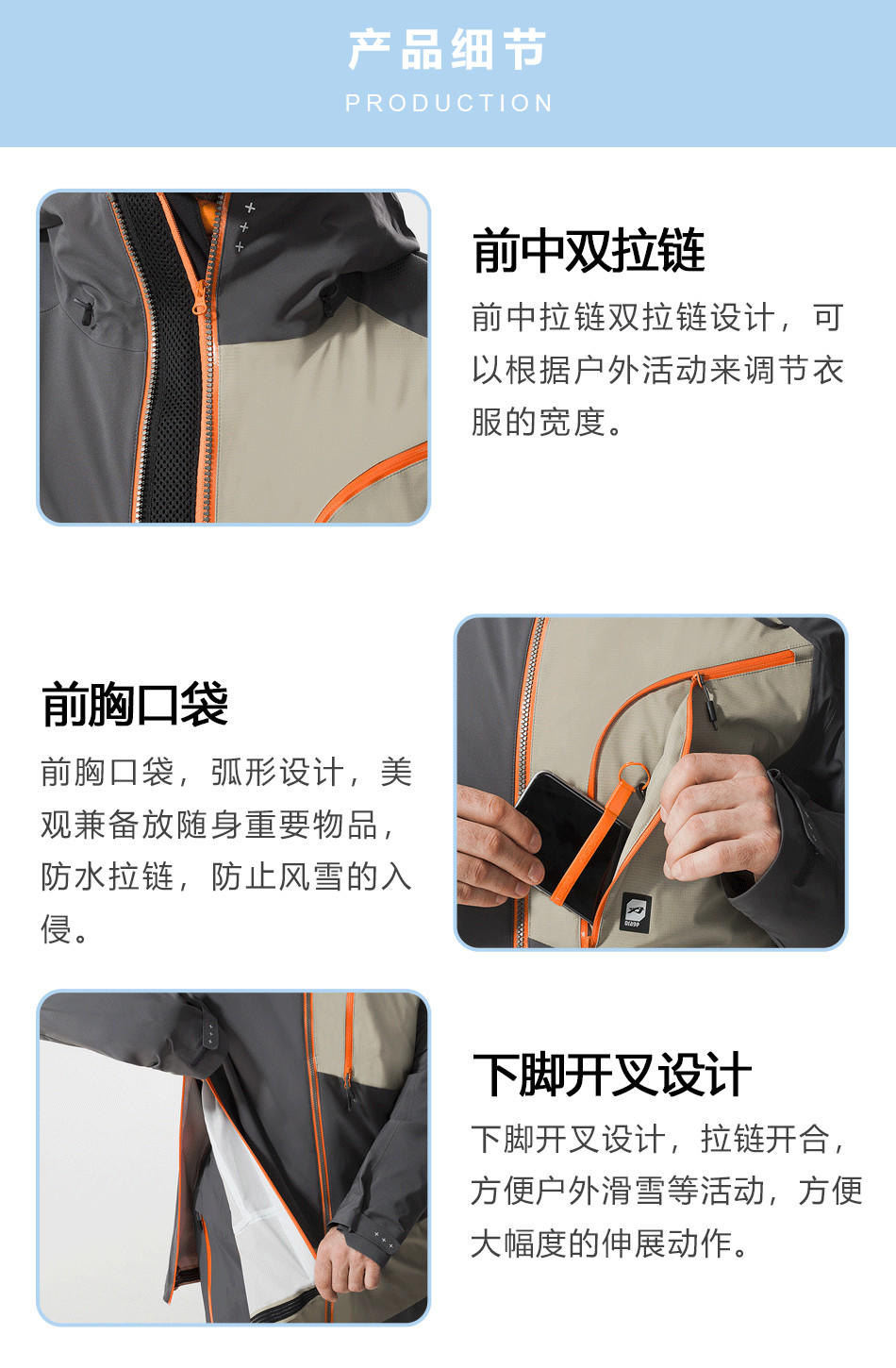 【下腳開叉設(shè)計】拉鏈拉合,方便戶外滑雪等戶外活動而需要的大幅度動作