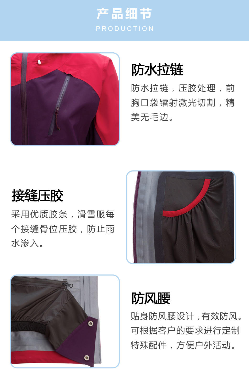 接縫壓膠:壓膠滑雪服生產采用優(yōu)質膠條,滑雪服每個接縫骨位壓膠,防止雨水滲入。
