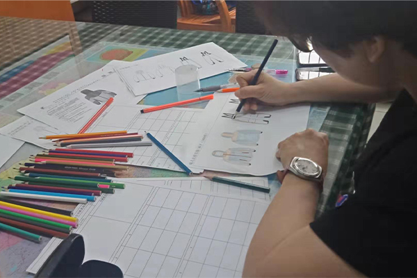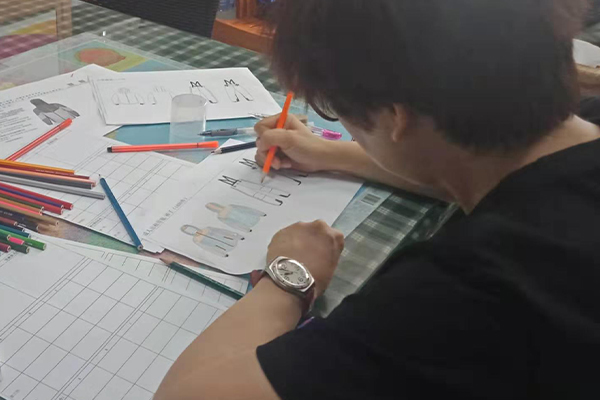 盡管困難重重,我們也要想進(jìn)一切辦法做到,不僅要做好,而且要做到最好!我們的總經(jīng)理自己也搖身一變設(shè)計(jì)師——畫稿,可以看到以下的圖片,認(rèn)真、負(fù)責(zé)的態(tài)度,用心的為客戶所思,一筆一筆的畫好,一點(diǎn)點(diǎn)的涂好顏色;還有一個紙樣哥哥也在幫忙畫,他們兩個人在一兩天的時(shí)間內(nèi)要畫好接近10個款衣服和褲子,雖然我們的時(shí)間不多,但是睿牛的小伙伴們也是很努力的去做,努力過就不曾后悔。