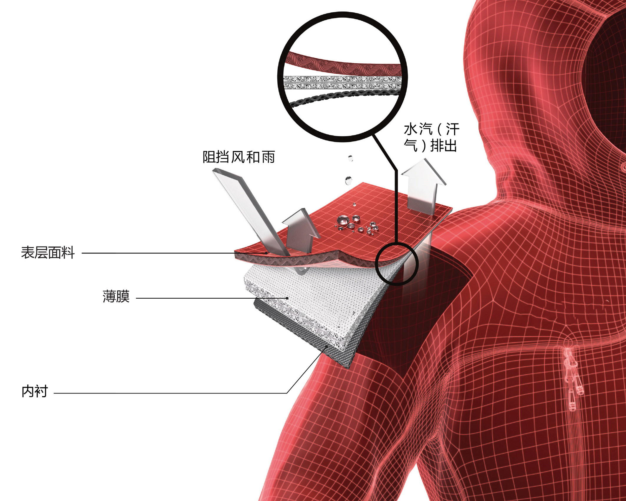 2、三層壓膠面料:在外面料下復(fù)合防水透氣層,然后復(fù)合一層內(nèi)襯,做成衣時(shí)不需要加襯里。